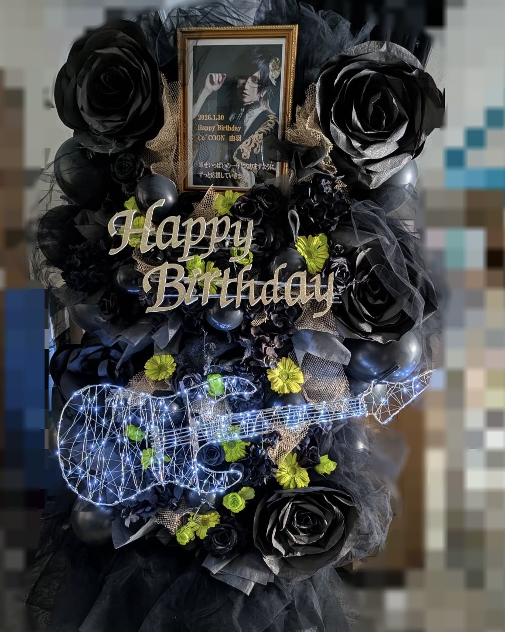 夜のイベントにもぴったりな、光るギター付きの華やかなバルーンフラワーです。
