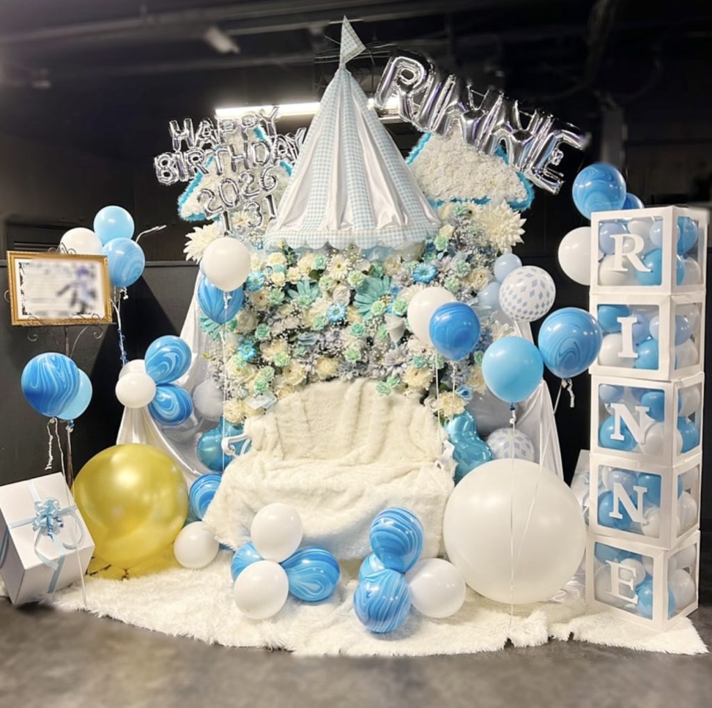 推しの特別なライブや誕生日イベントで撮影ブースとしてご利用頂ける、ベンチ付きの華やかなバルーンフラワーです。